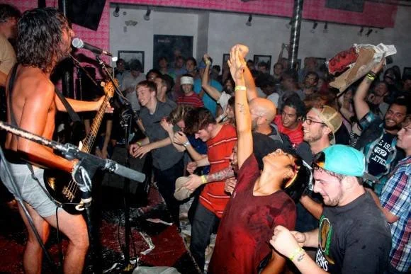Four men posing in a bar, wearing casual and graphic t-shirts, one with a 'Hooters' logo, one with a Hawaiian shirt, Shannon & The Clams, another with a backwards cap, and the fourth with a Rolling Stones tongue design.